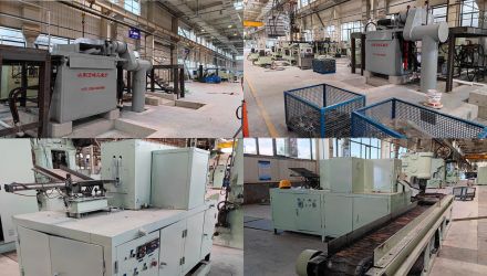 生產(chǎn)線組件:感應(yīng)熔煉爐; 鋁合金壓鑄設(shè)備; 感應(yīng)加熱爐; 鋁合金鍛造設(shè)備; 冷卻機(jī); 集塵器;?