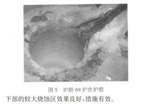 本次試驗爐齡 79 爐次達(dá)到了預(yù)期壽命,說明試 驗方案合理,試驗成功。從試驗過程中觀察到:中期 燒結(jié)有效地減緩了爐襯的損耗速度,措施有效;兩次 中修均達(dá)到了預(yù)期目的,使用短坩鍋中修應(yīng)對爐膛下部的較大燒蝕區(qū)效果良好,措施有效。