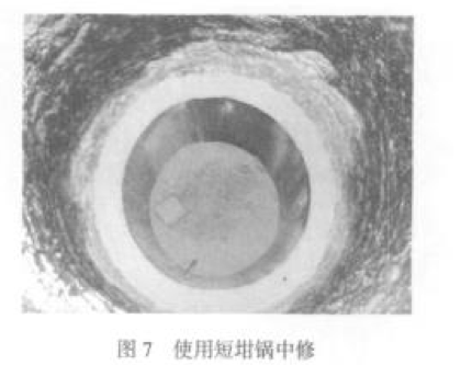 2009 年 4 月進(jìn)行了第二次試驗。在整個中頻爐開爐過 程中,有過 5 次較長時間的停爐,中頻爐爐膛未出現(xiàn)大裂 紋。在爐齡 25 爐次時,進(jìn)行第二次燒結(jié),燒結(jié)工藝是 在燒結(jié)溫度保溫 2h。在爐齡 42 爐次時,在爐襯中下 部出現(xiàn)較大的燒蝕區(qū),進(jìn)行第一次中修,中修工藝是 使用短坩鍋和爐襯材料修筑爐膛底部,經(jīng)過短暫燒 結(jié)后正常開爐(圖 4)。在爐齡 69 爐次時,爐膛情況正 常(圖 5),使用短坩鍋進(jìn)行第二次中修。在爐齡 79 爐 次時,因中頻爐設(shè)備原因停止試驗,爐膛良好。