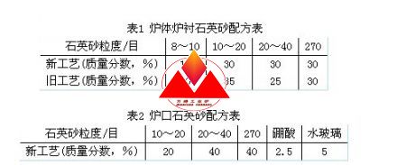 石英砂的粒度配比及搗固方法影響爐襯的使用壽命,其主要影響爐襯的耐蝕性能和抗高溫沖擊性能。經(jīng)試驗,爐襯的抗侵蝕能力與其基體密度成正比,密度越大,基體組織越密,爐襯的抗侵蝕能力越強。在結(jié)合客戶實際生產(chǎn)的基礎(chǔ)上,采用表1所示的石英砂配方。爐口石英砂采用表2所示的改進配方。